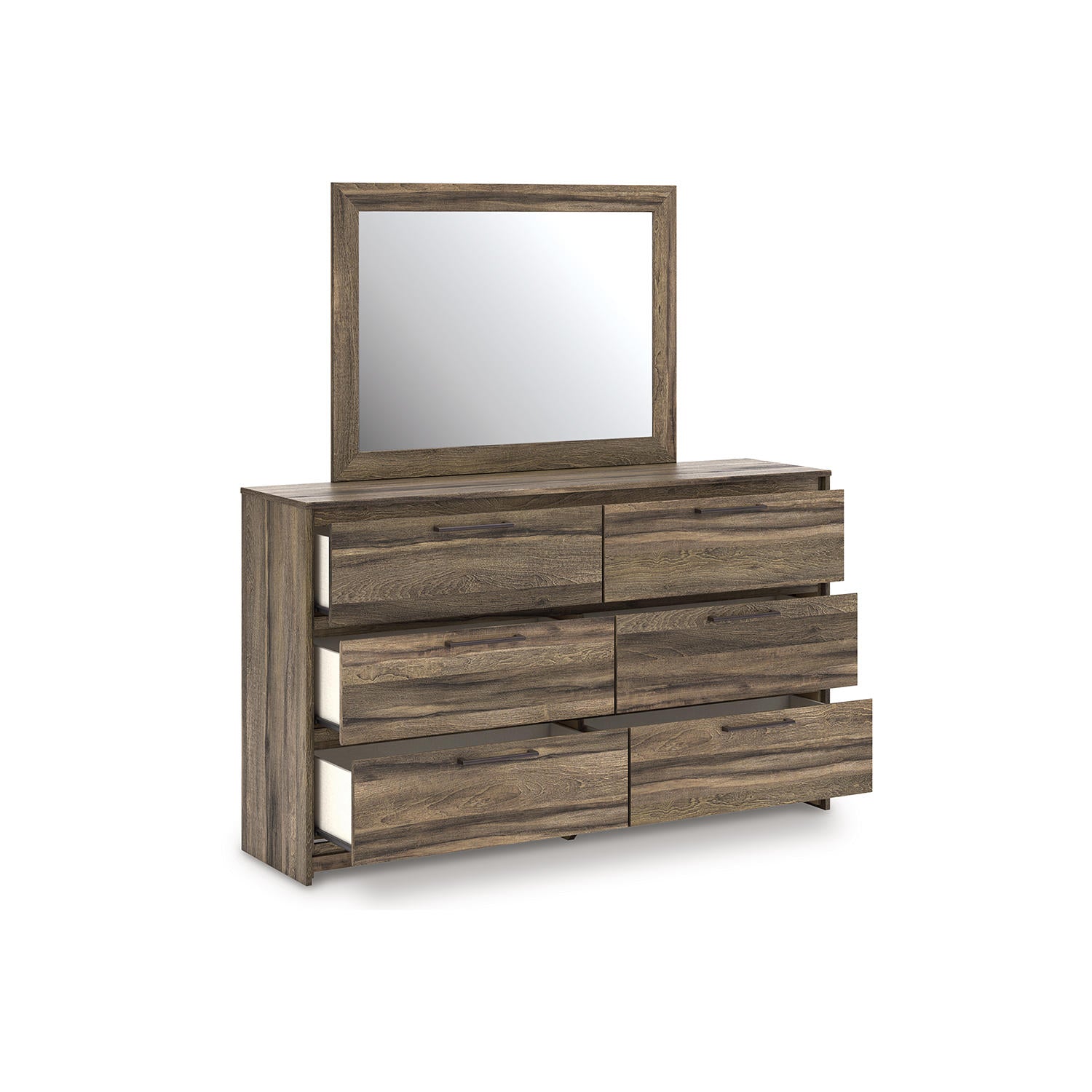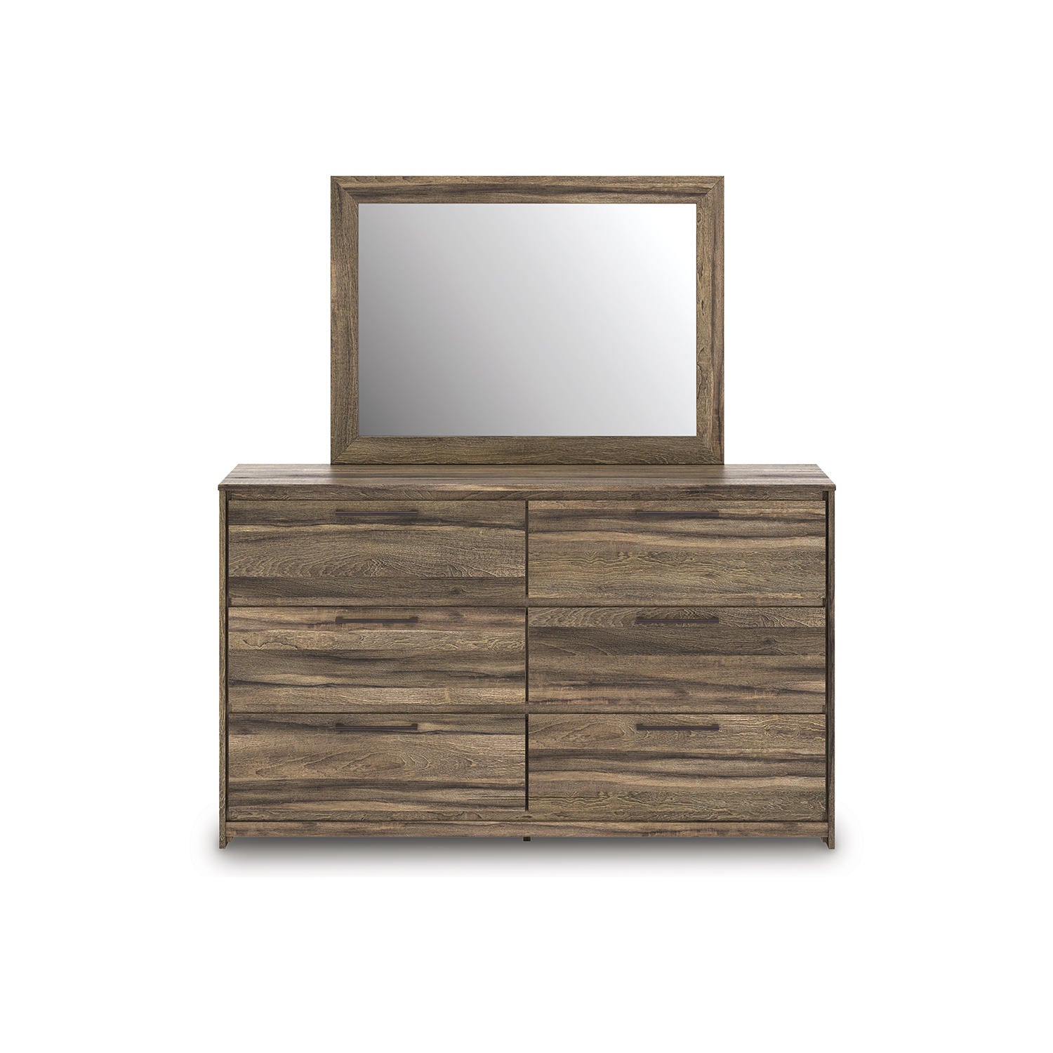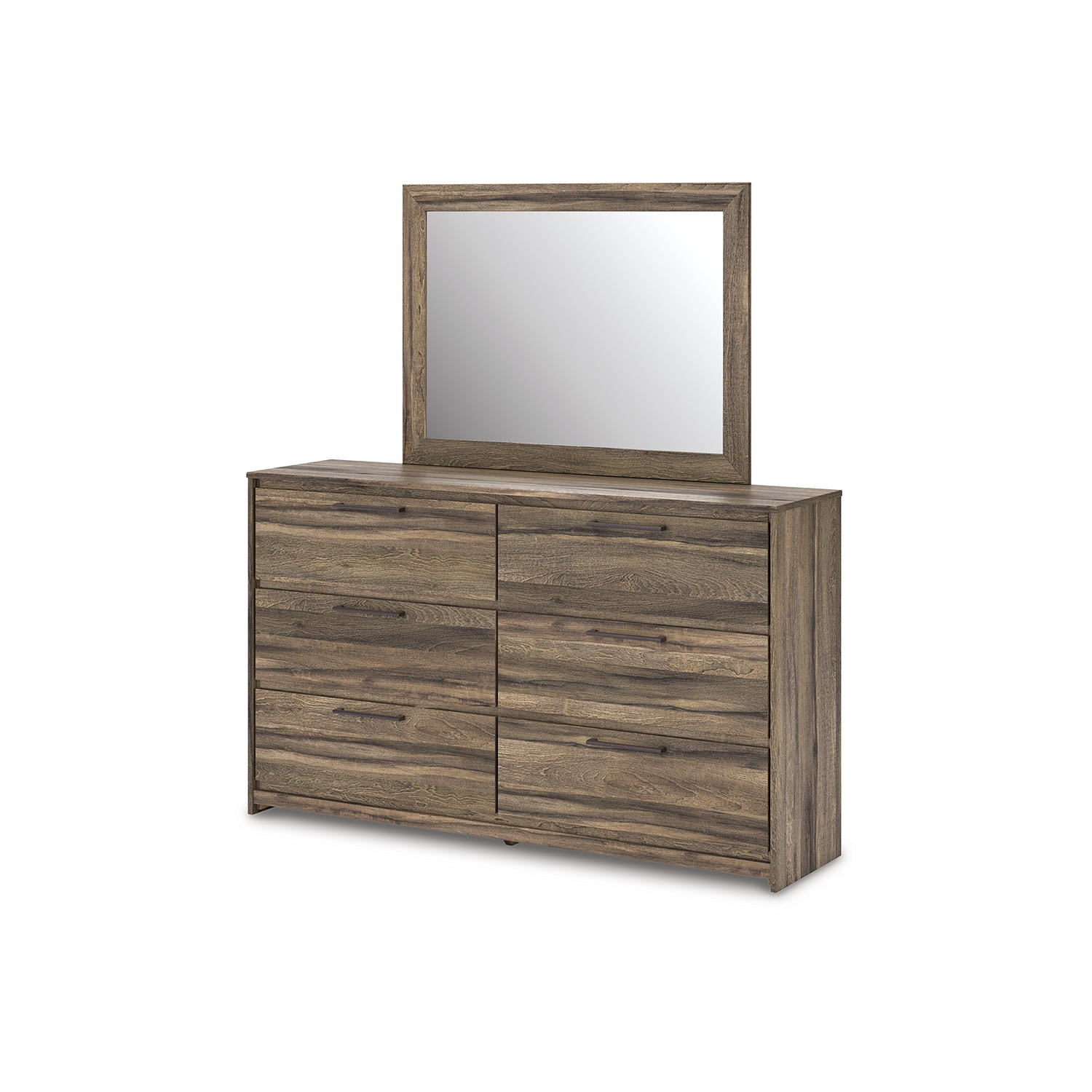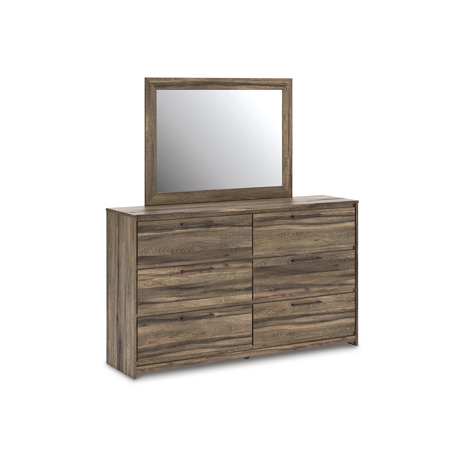 Casually cool style and lots of storage go hand in hand with this dresser and mirror. A weathered brown finish over replicated oak grain creates an easygoing vibe, setting the scene in your restful retreat. Clean lines and modern handles provide a fuss-free look. And the dresser's six roomy drawers give you plenty of space for stowing away clothes and more.