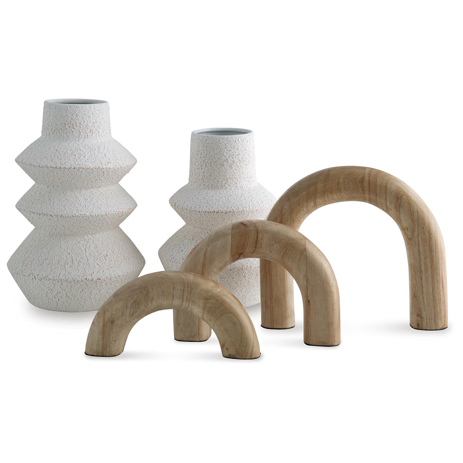 Craft a contemporary haven with the delightfully neutral tones and modern forms of this accessory set. Its sculptures, with their seamlessly streamlined arch designs, can be displayed together or stand solo as subtle statement pieces. The tiered look of the eye-catching vases adds that much more geometric interest.