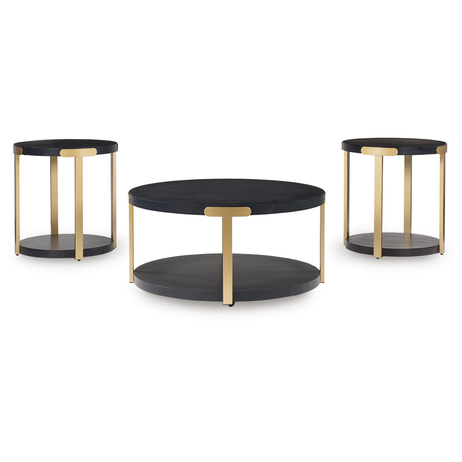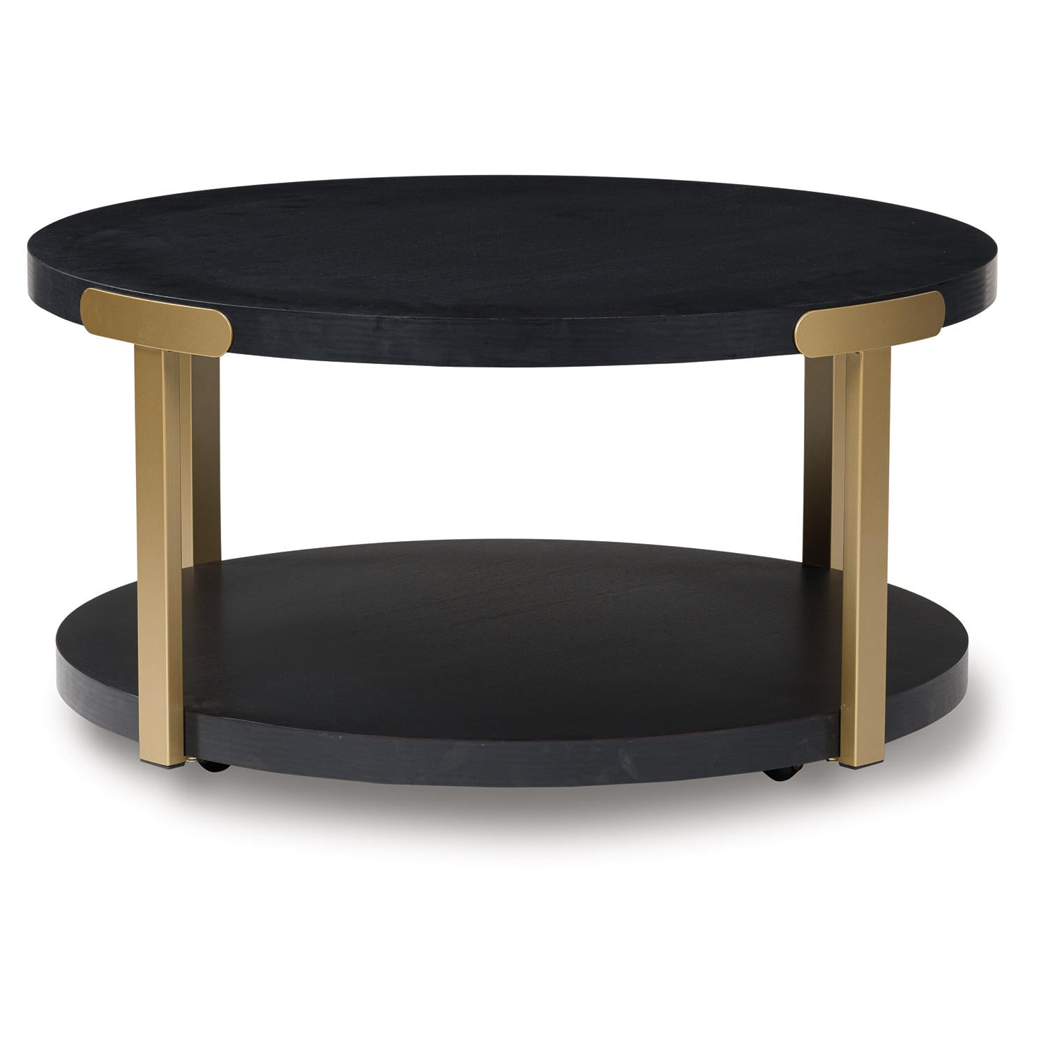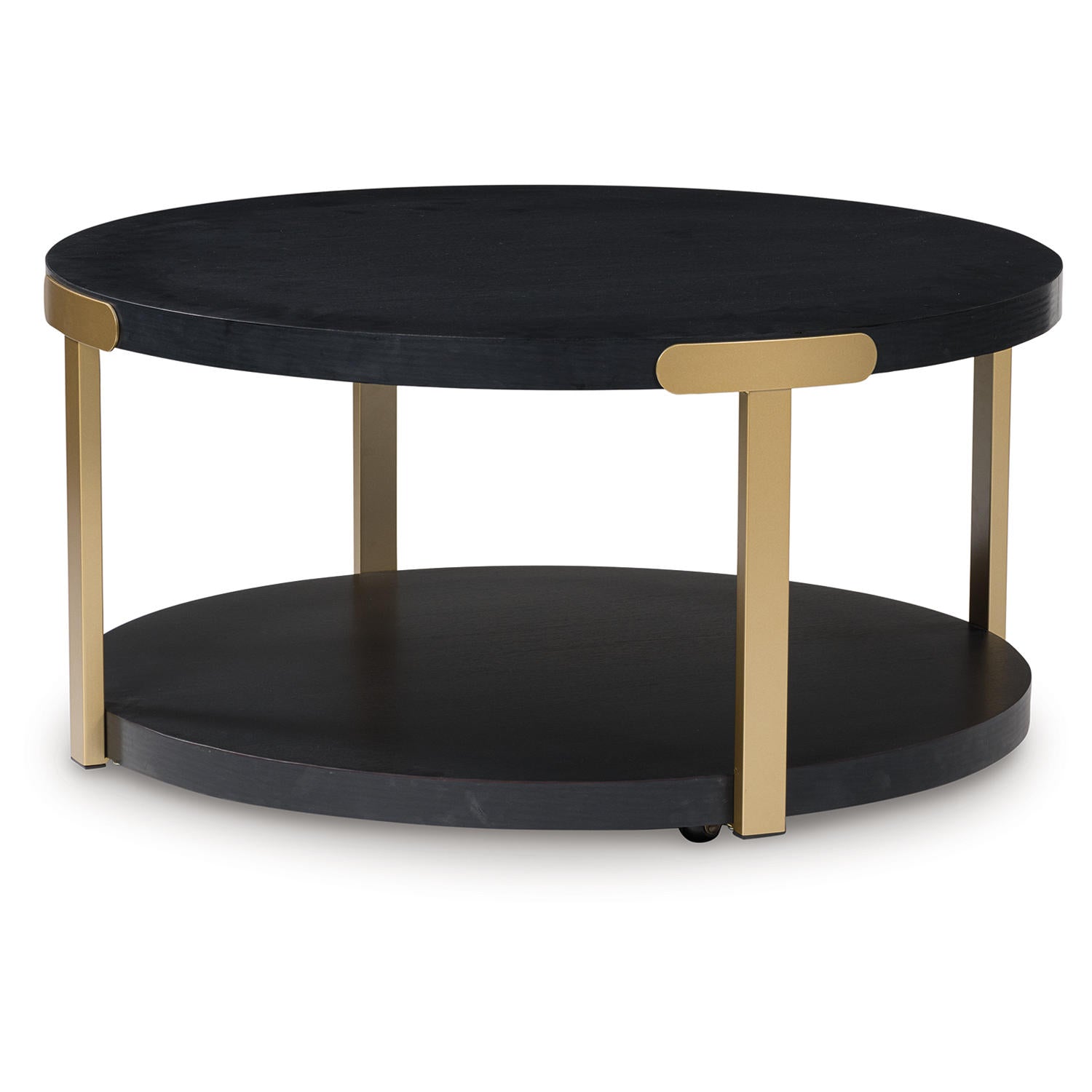 Reflect your cool, contemporary eye for design with this table set. Pairing a gleaming goldtone finish and black wood grain pattern, it crafts a luxe look for your living room. The lower shelves are well-suited for displaying your favorite decor, while casters on the coffee table offer added flexibility.