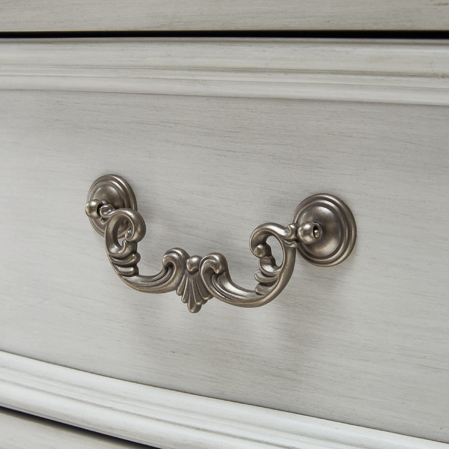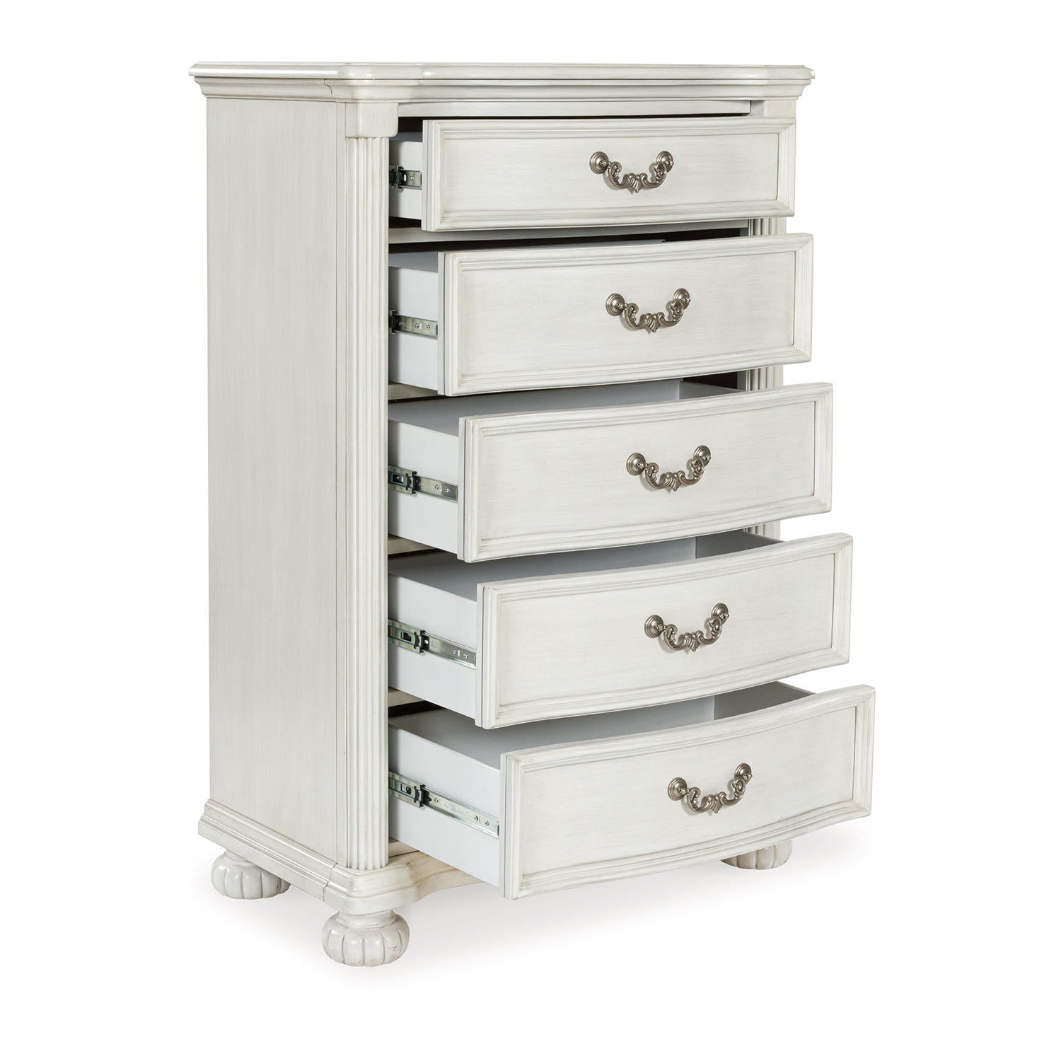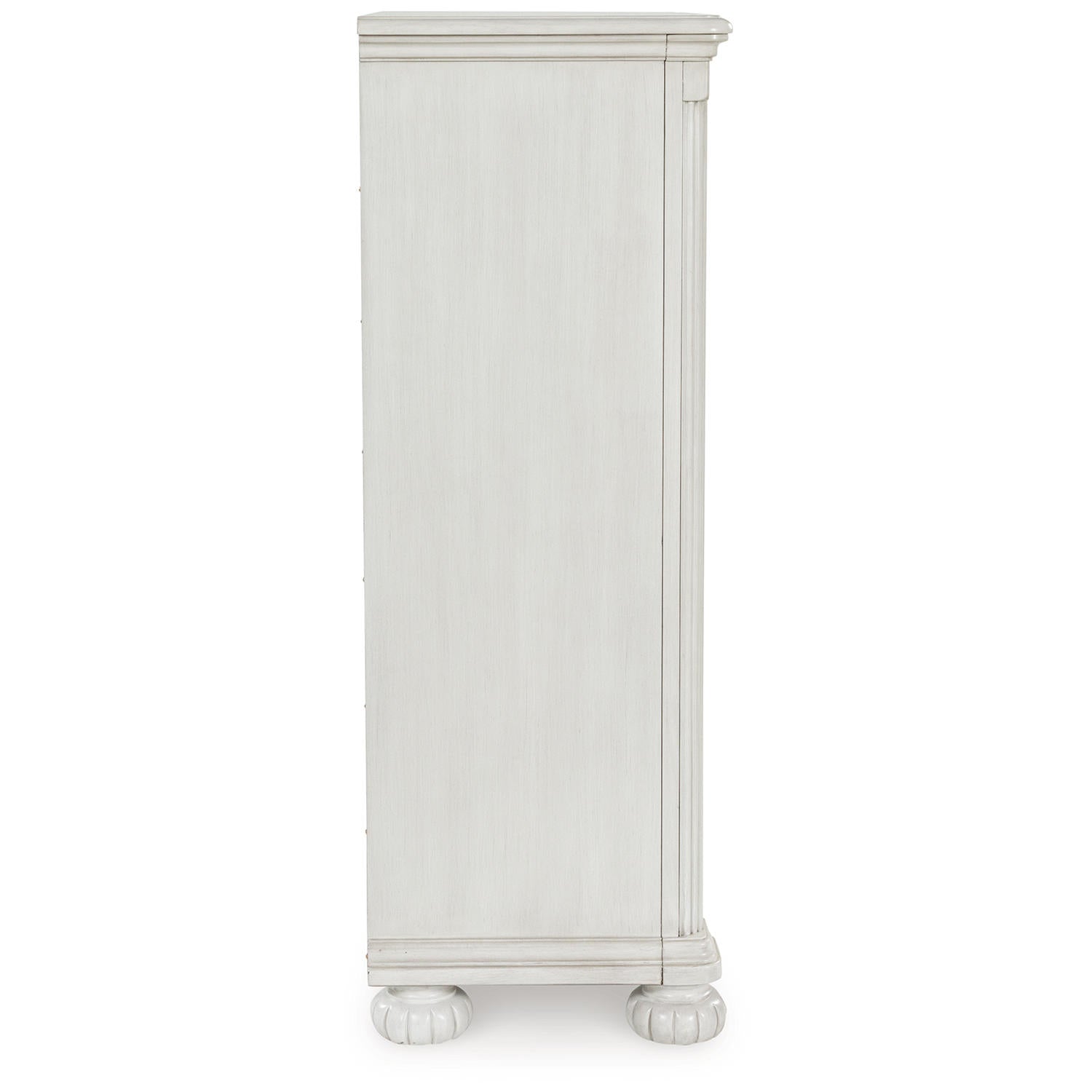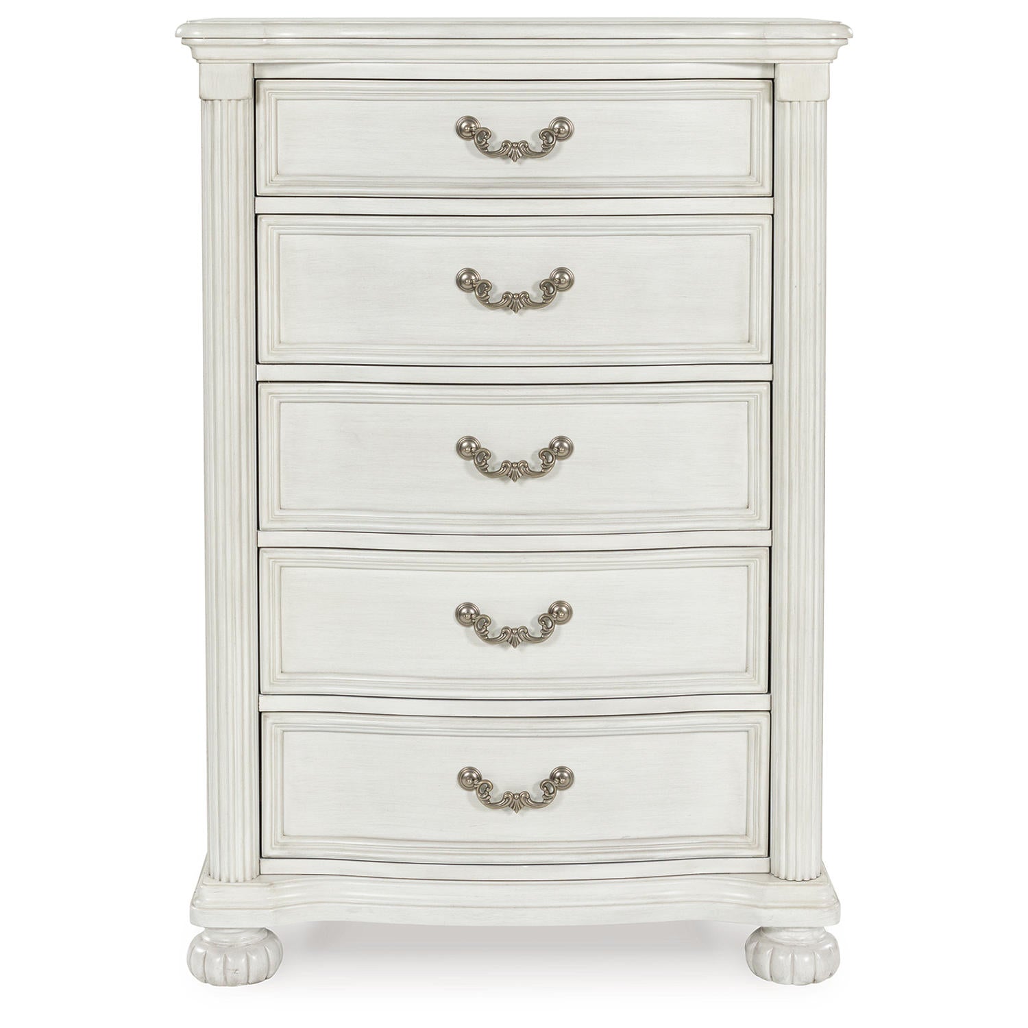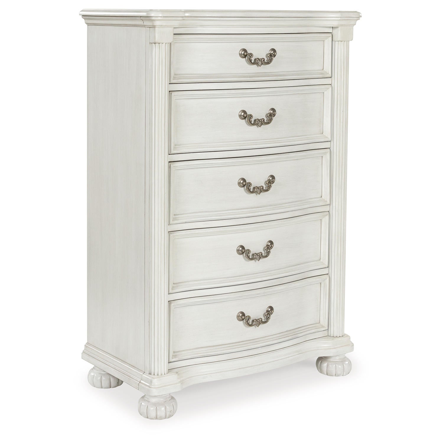 Transform your inner sanctum into a haven of timeless elegance and functionality. This traditionally styled chest of drawers is adorned in a classic antiqued white finish, highlighted by a serpentine-shaped front with thick decorative moulding. Its drawers are packed with ample storage possibilities. And did we mention the stylish reeded bun feet? Talk about relaxed refinement.