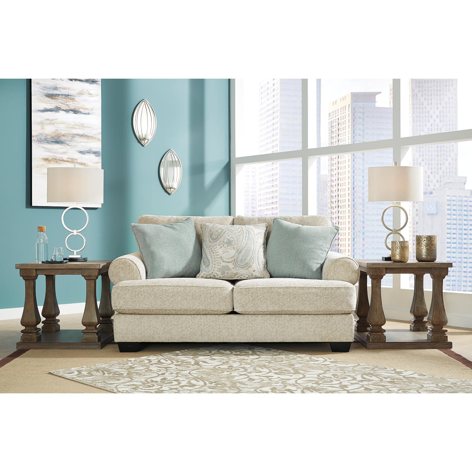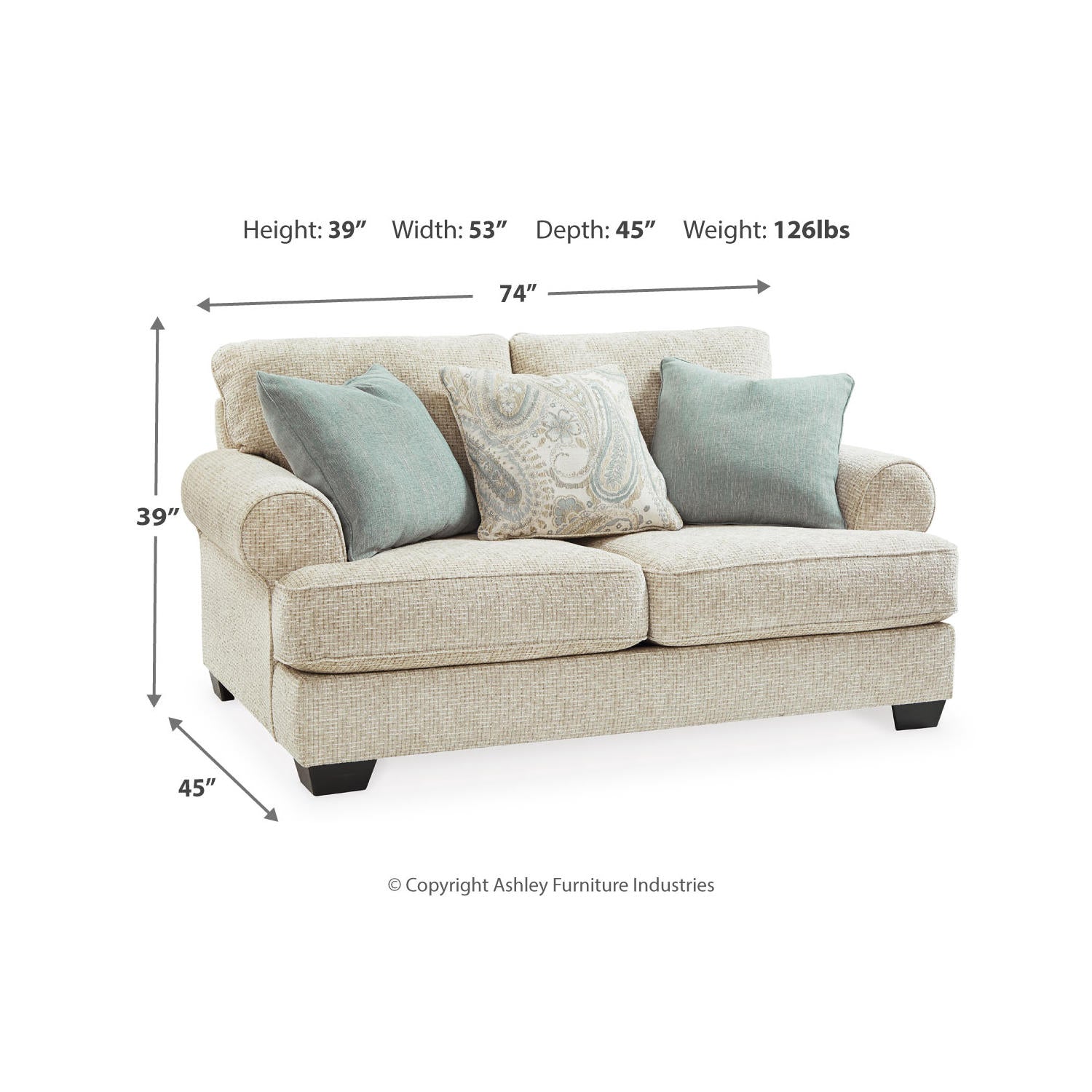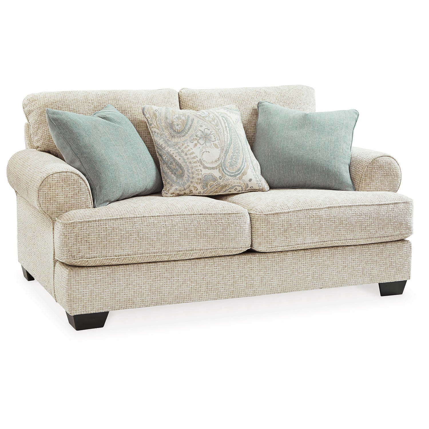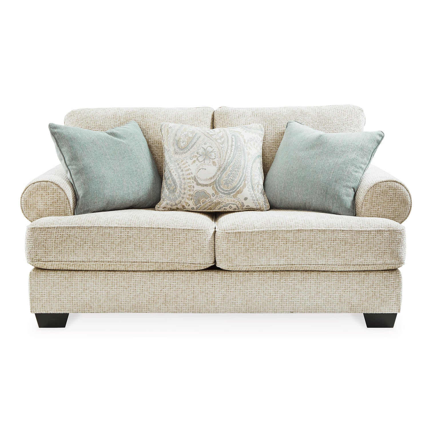 This loveseat strikes a beautiful balance between classic and current. Its traditional elements include t-cushion seating and setback roll arms, angled for modern flair. Posh pillows in spa mist and jacquard paisley make a muted, mellow complement to the loveseat’s casual textured chenille upholstery. And the choice of sandstone beige is a light and lovely style awakening.