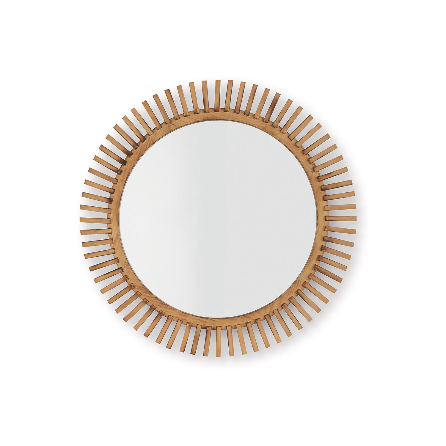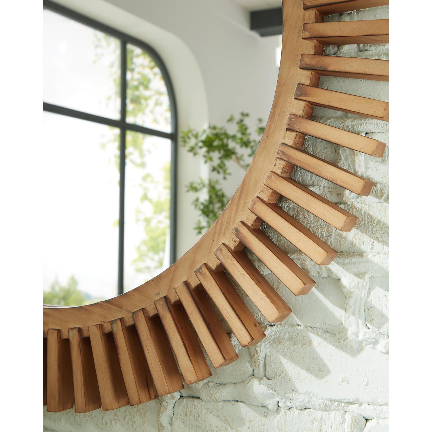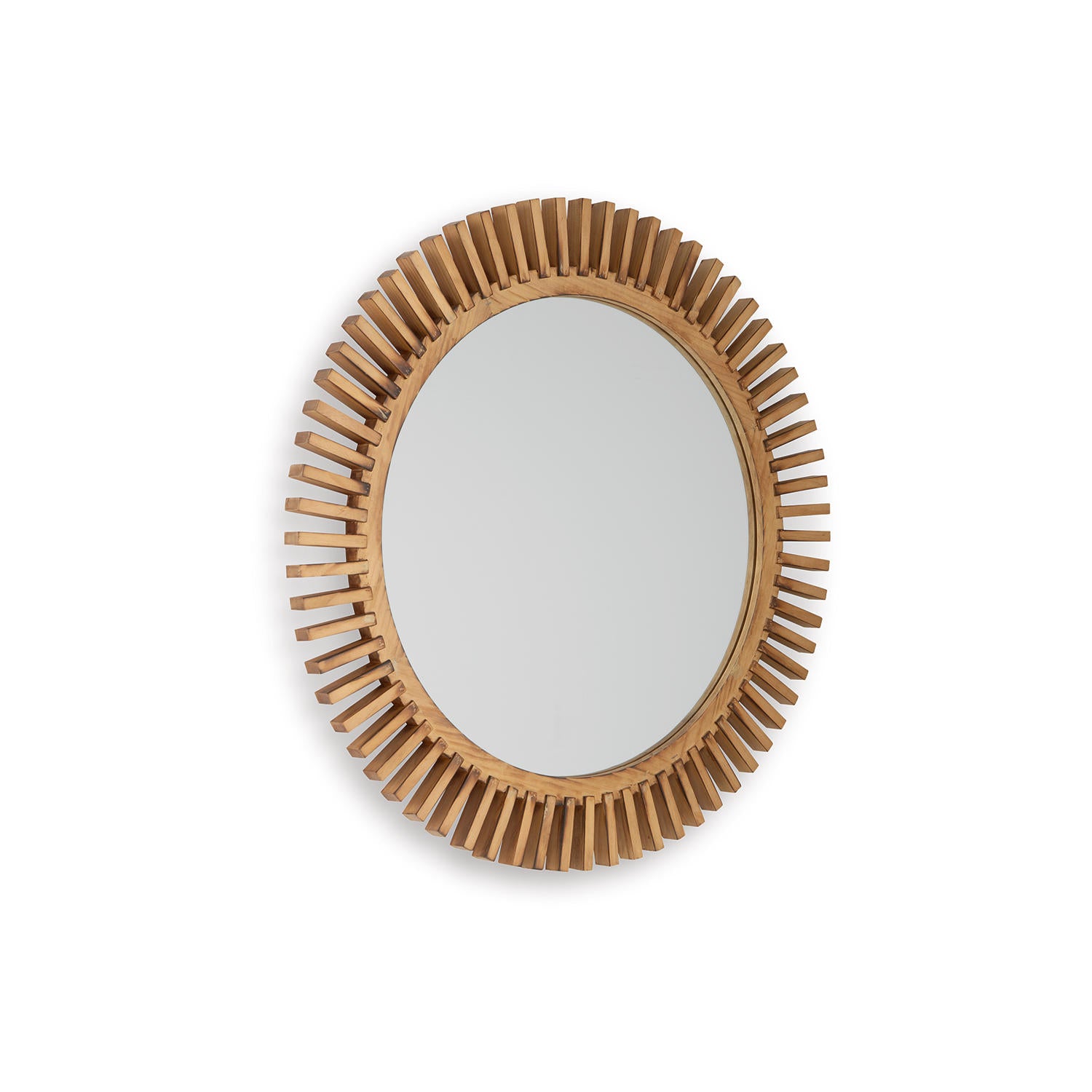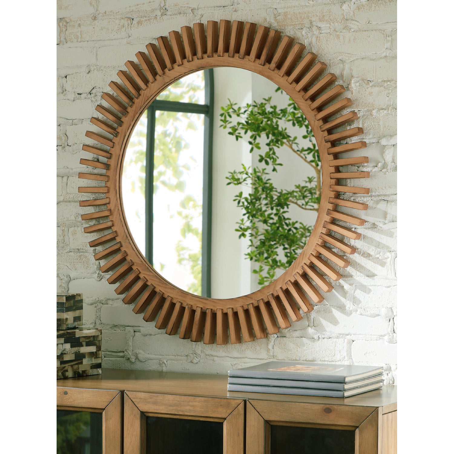 Brighten your space with this contemporary accent mirror. Its warm brown wood sunburst design offers organic texture and visual interest galore. Hang it as a statement piece, or pair it with other decorative elements for a curated look.