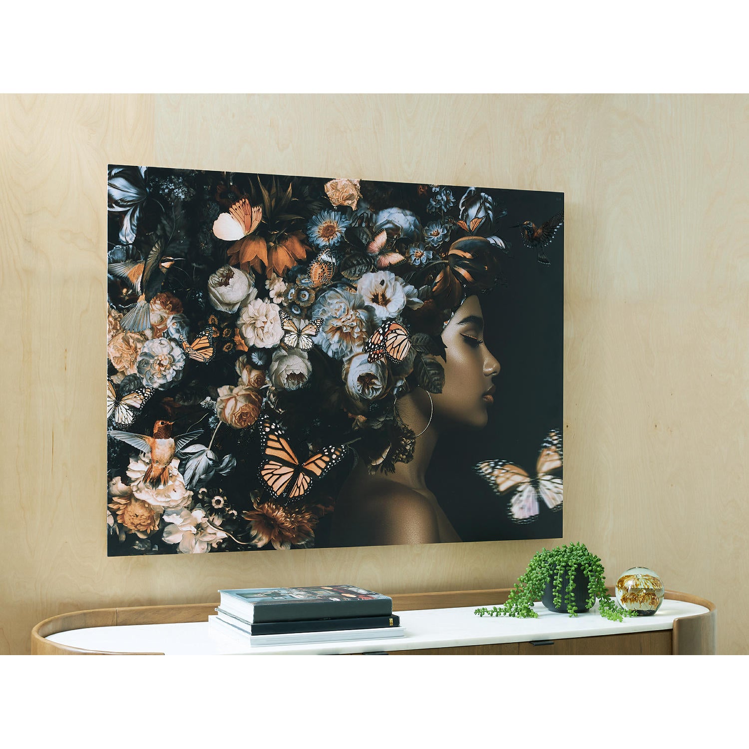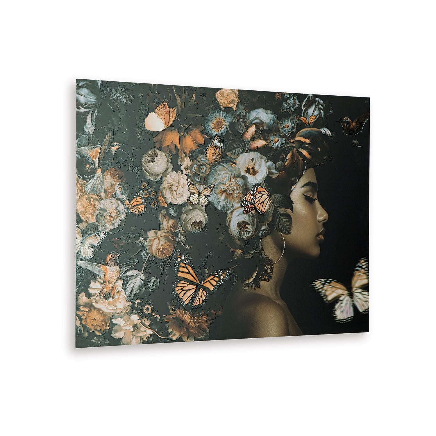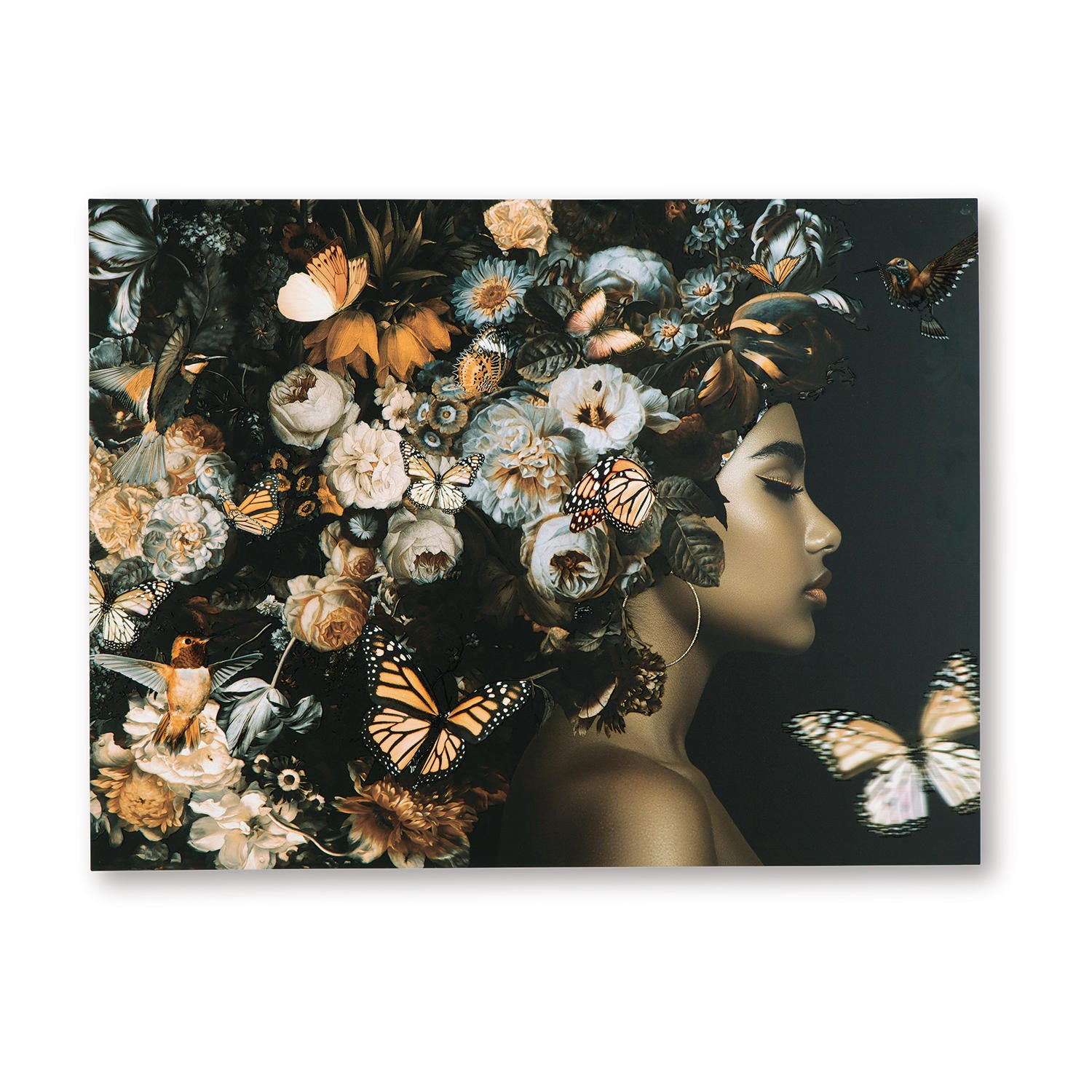 This wall art is a captivating piece that celebrates nature's profuse beauty. A stunning portrait of a woman with a flowing headdress teeming with flowers and butterflies, it adds a touch of elegance and enchantment to your home. The rich color palette and intricate details create a visually stunning display, while the overall composition exudes a sense of tranquility.