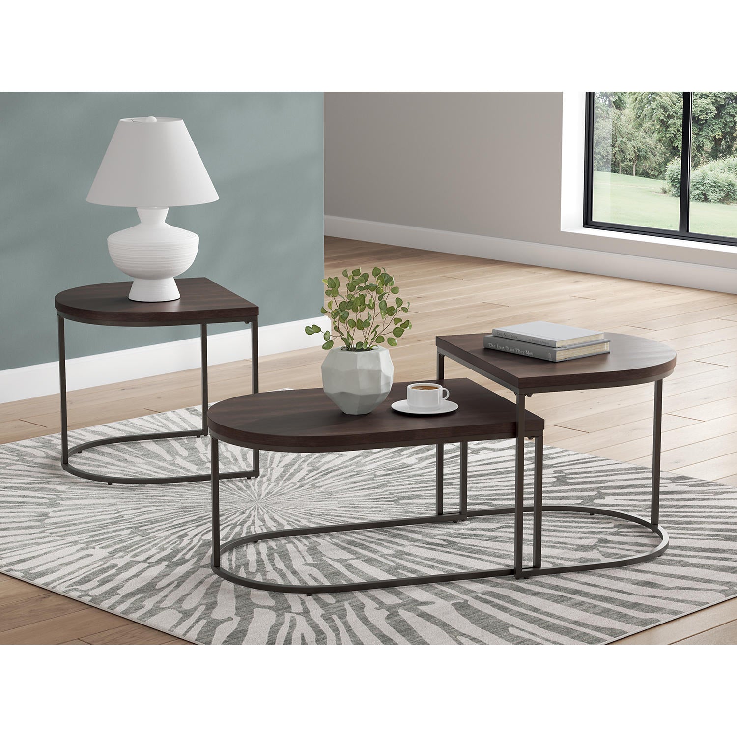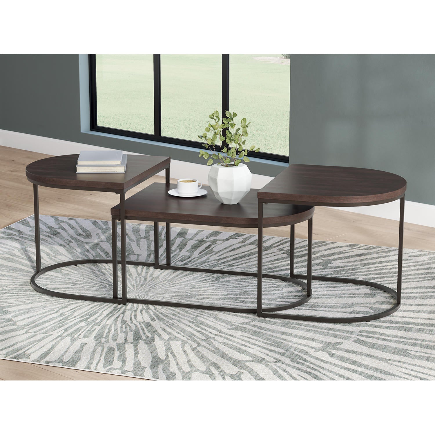 This table set introduces a luxe vibe to your living room. It pairs a mixed-material look in dark tones with a geometric design for a new take on contemporary convenience. And the two end tables can nest with the coffee table, crafting a unique setup ideal for tiered decor displays.