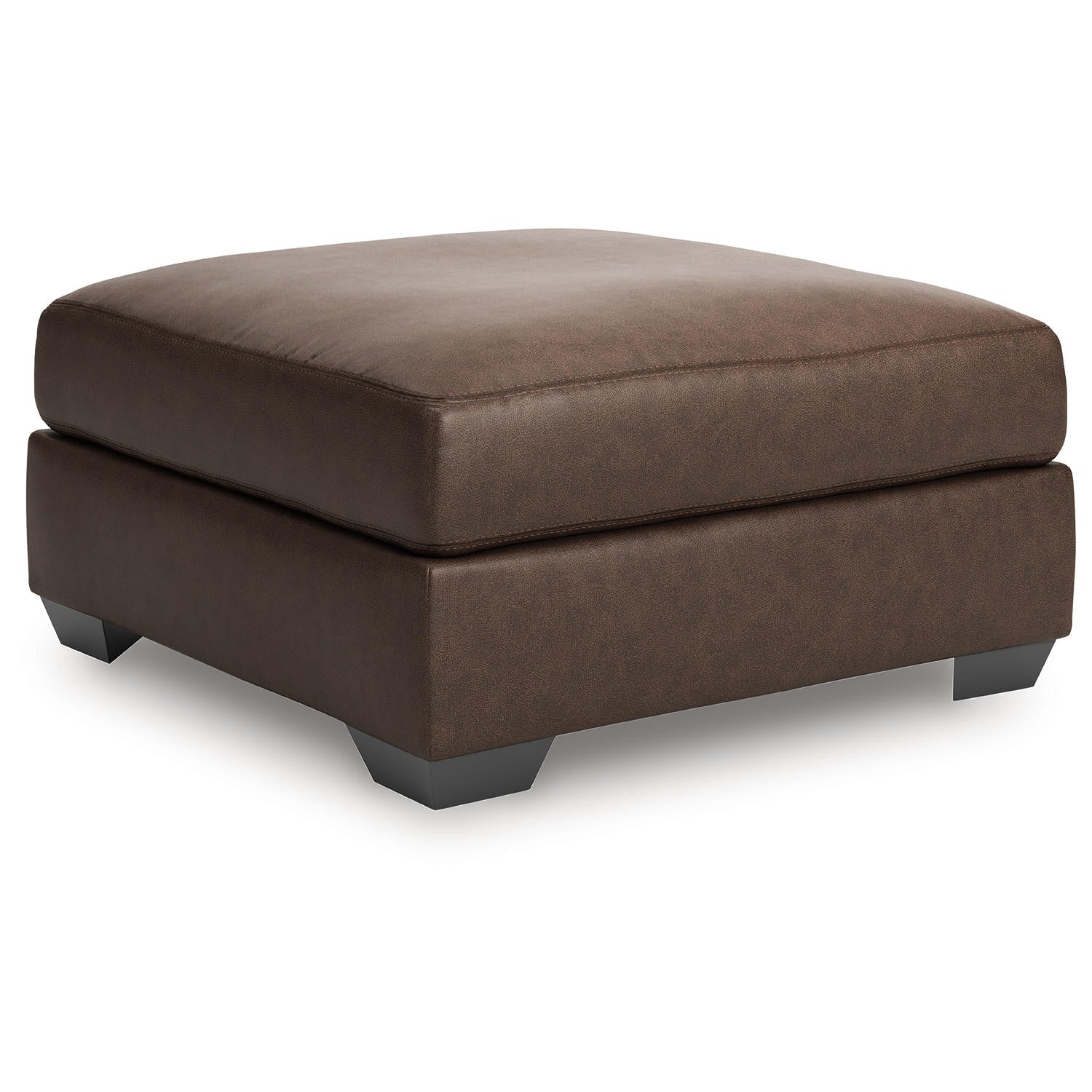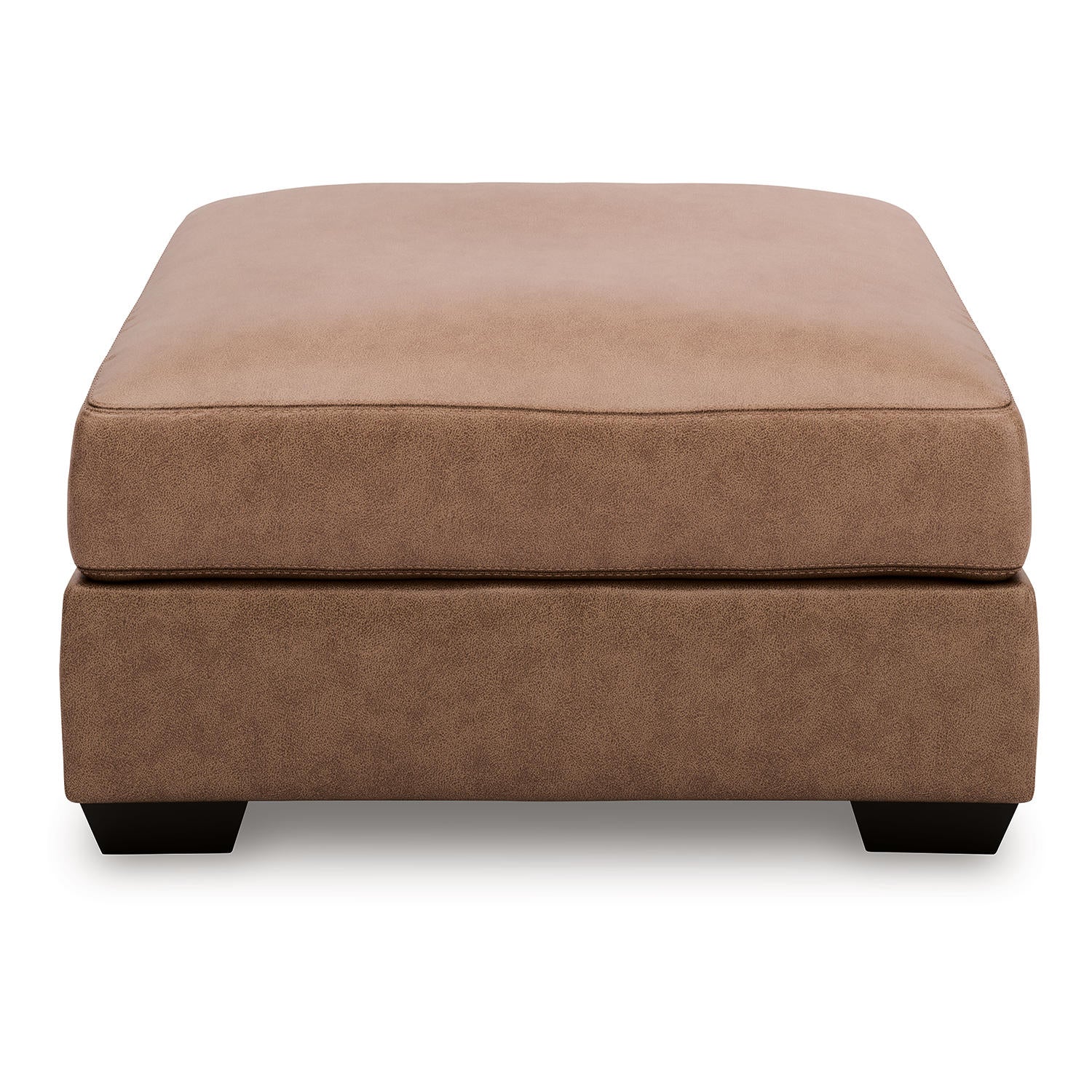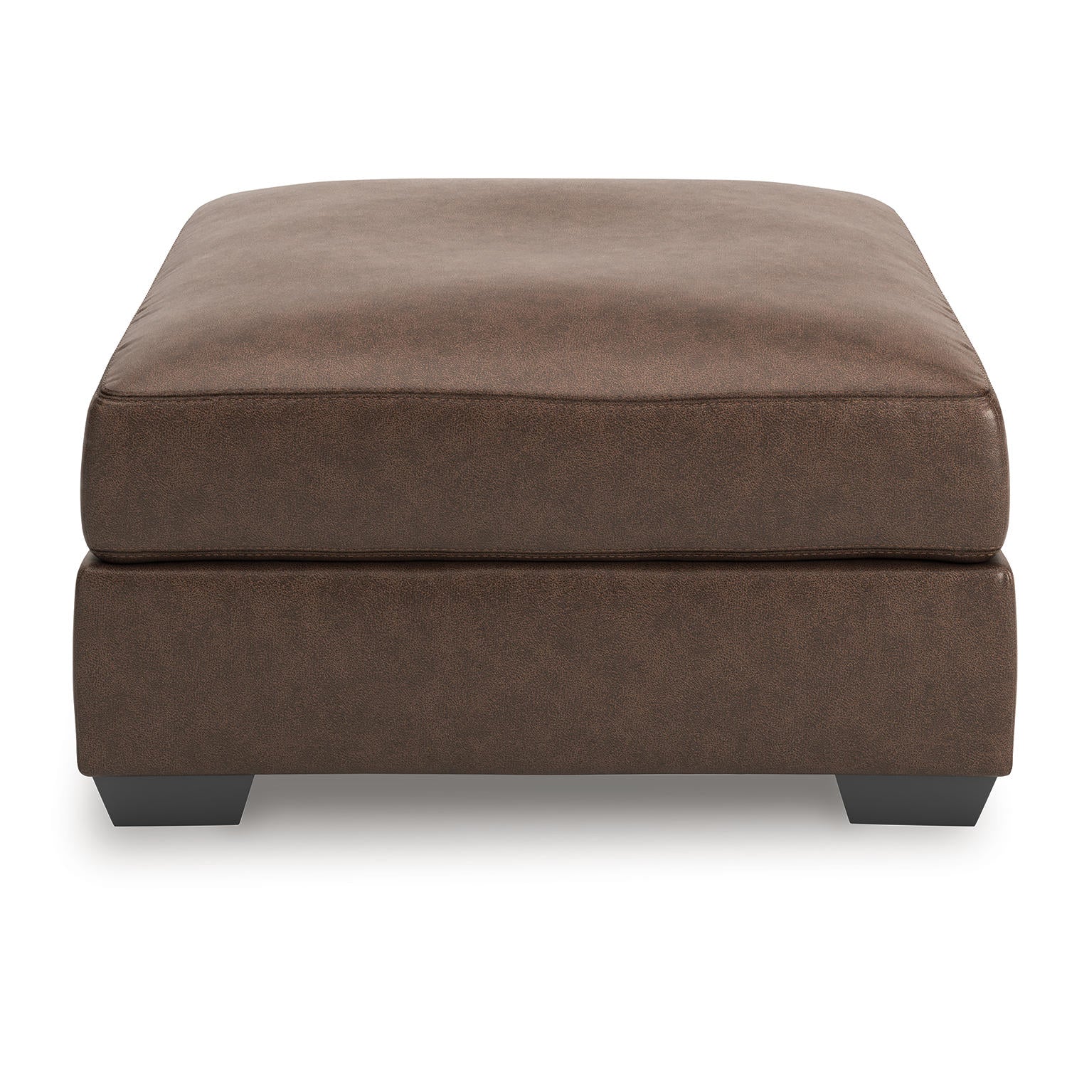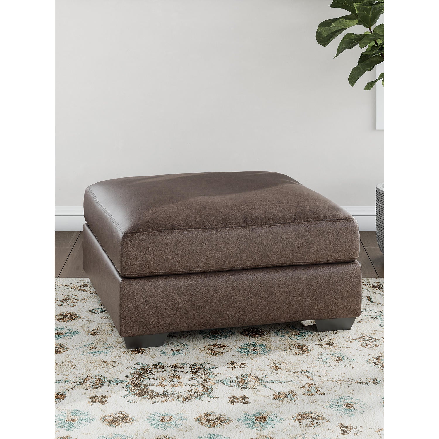 Modern comfort never looked so good. Accented with jumbo stitching for high-fashion flair, this oversized ottoman is the ultimate choice in comfortably cool, contemporary style. Its umber-hued faux leather indulges with an upscale feel and wows like the real thing.