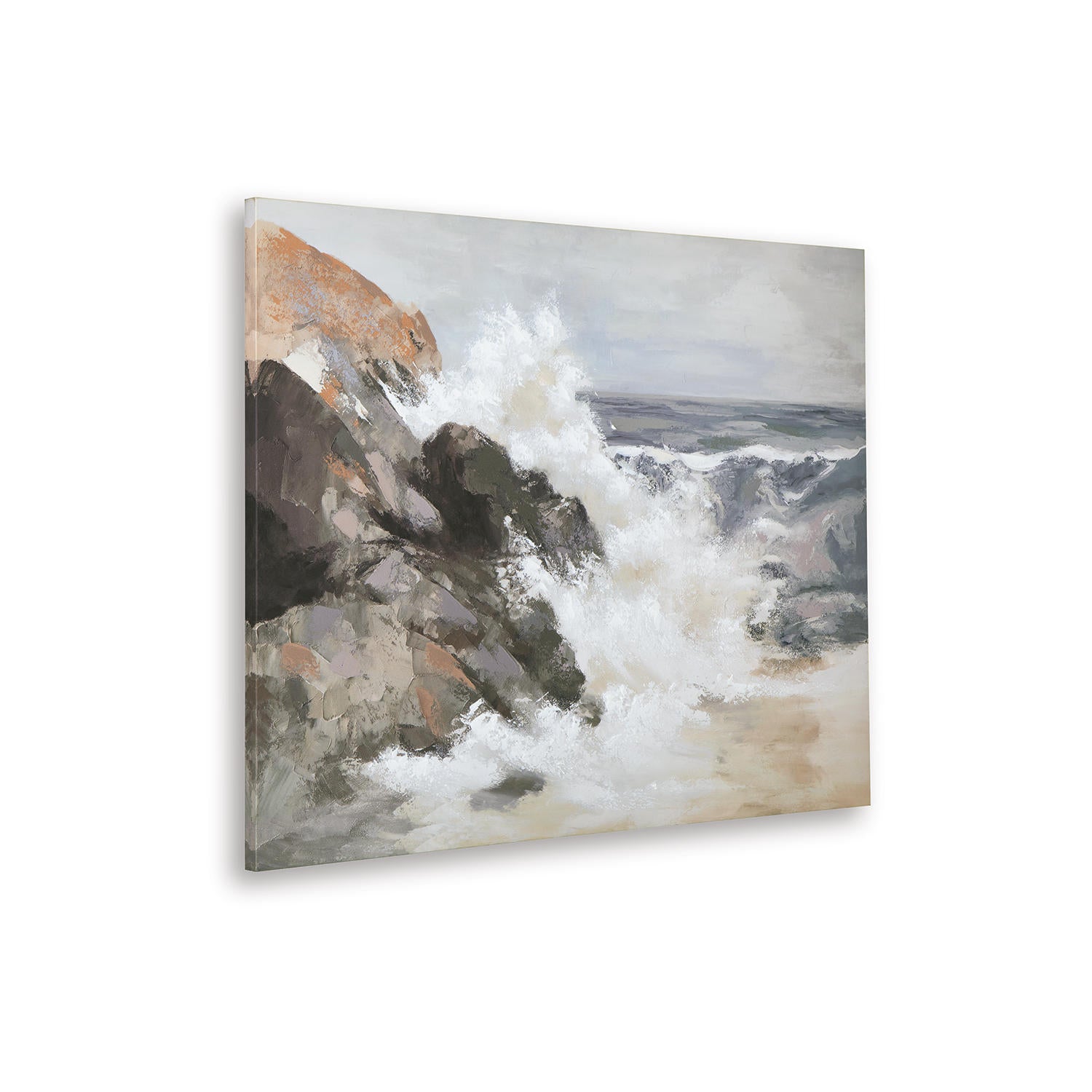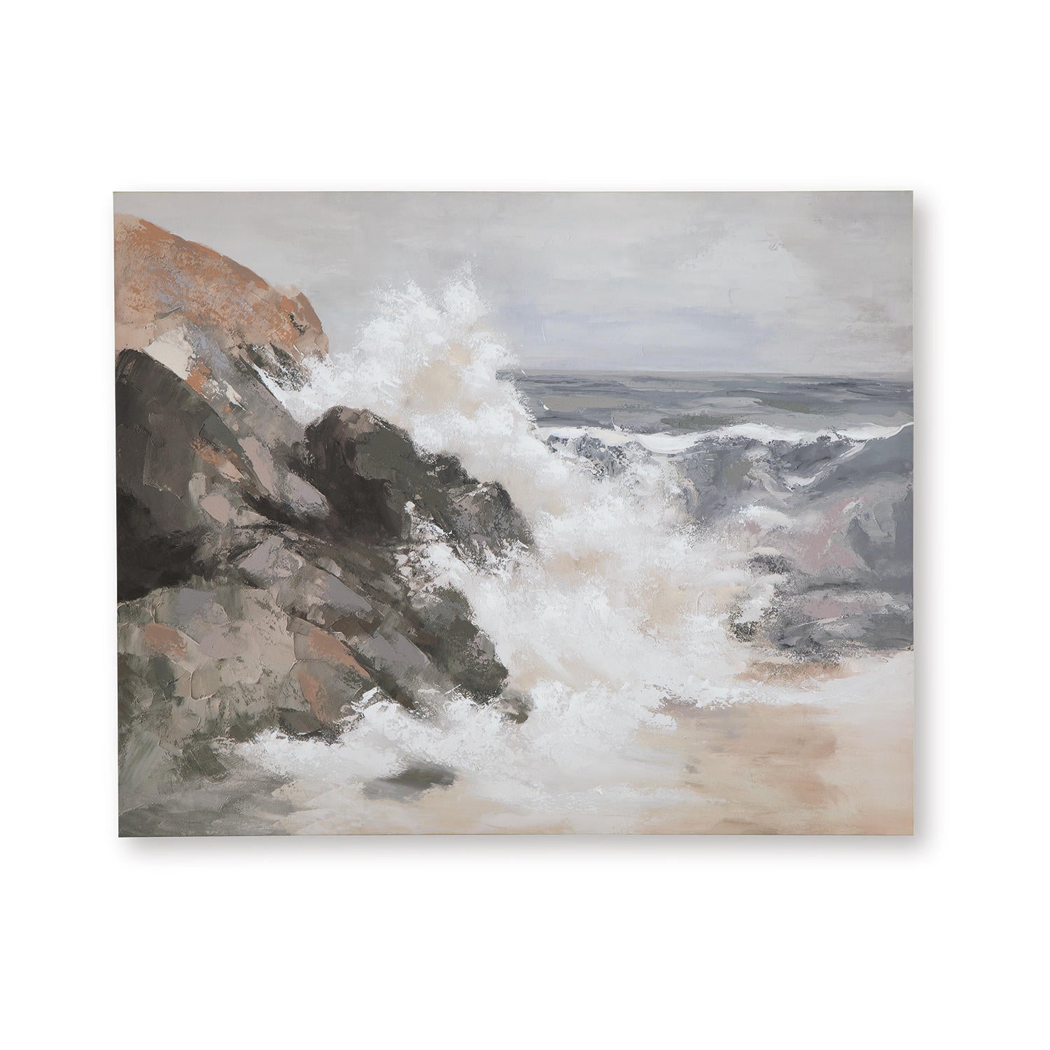 Stormy weather has never looked better. This wall art is marvelously moody, with a seascape design in shades of gray, white and tan. Can’t you just feel the spray of the waves on your face as they crash against the rocks?